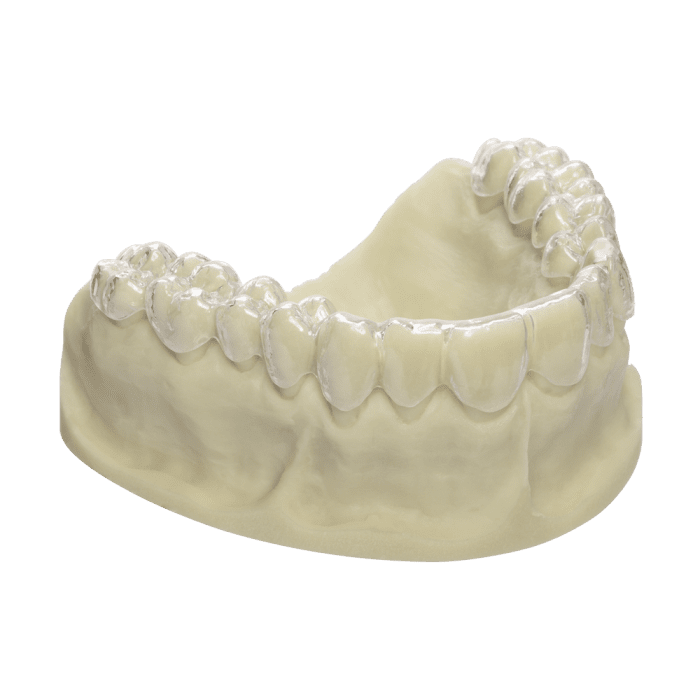Dreve’s thermoforming blank made of PETG (Polyethylene terephthalate glycol) is supplied with an insulating film for the purpose of high transparency. Since it is tough-elastic and can be built up with acrylate, it is particularly suitable for aligners, bite and occlusion splints, as well as for orthodontic appliances.